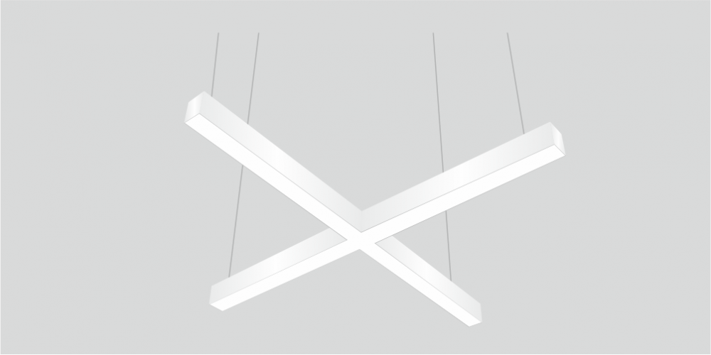 Светодиодный Лучевой светильник LiNE-Pro 4х500mm 40W 5000K белый предназначен для накладного или подвесного монтажа на тросовые подвесы. Изготовлен из сплошного сварного алюминиевого профиля в виде буквы «Х» (крестом). Высота установки светильника регулируется подвесом с цанговым тросовым зажимом и может варьироваться от 0,05 метра до 4 метров от основного потолка. Крестовой светильник имеет равномерную засветку по всей площади рассеивателя. Источник питания находится внутри корпуса. Торцевые заглушки входят в комплект. Возможно изготовление светильника с магистральной проводкой для соединения нескольких светильников в сплошную конструкцию.